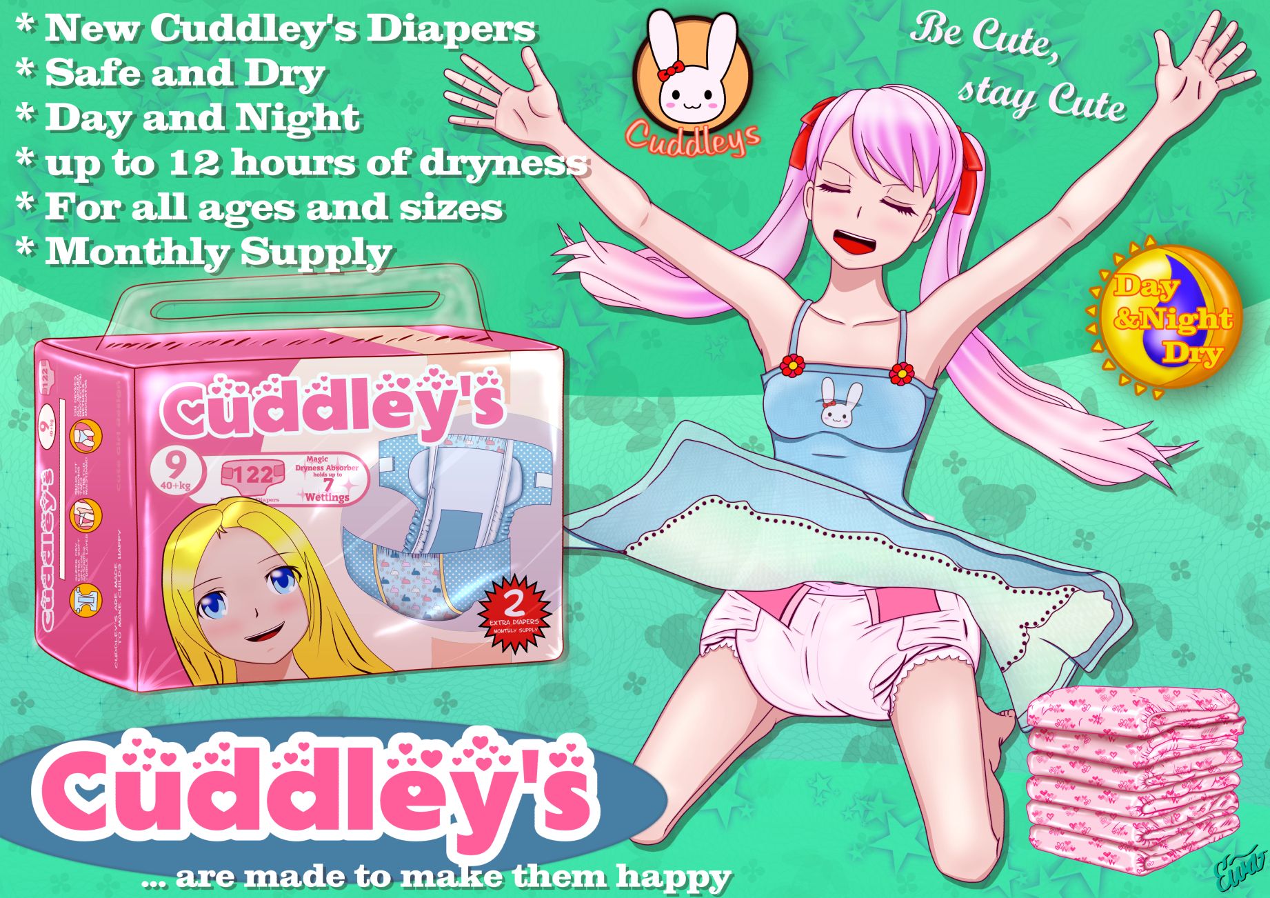 Oben im Bild seht ihr also einen meiner ersten Versuche in diese Richtung. Marie freut sich immer, wenn ihre monatliche Windellieferung eintrifft und ist ganz gespannt, ob ein paar neue Motive dabei sind. Sie drückt lachend eine Packung der Marke Cuddeley’s an sich, welche wirklich einen neuen Aufdruck auf ihre Windeln der Größe 9 herausgebracht haben. Marie kann es gar nicht erwarten, dass ihre Mutter sie nach dem Mittag frisch wickelt und hofft, dass sie eine der neuen Windeln ausprobieren darf. Die einfarbigen in Rosa, welche sie jetzt schon eine Woche trägt, werden ihr langsam ein wenig langweilig.