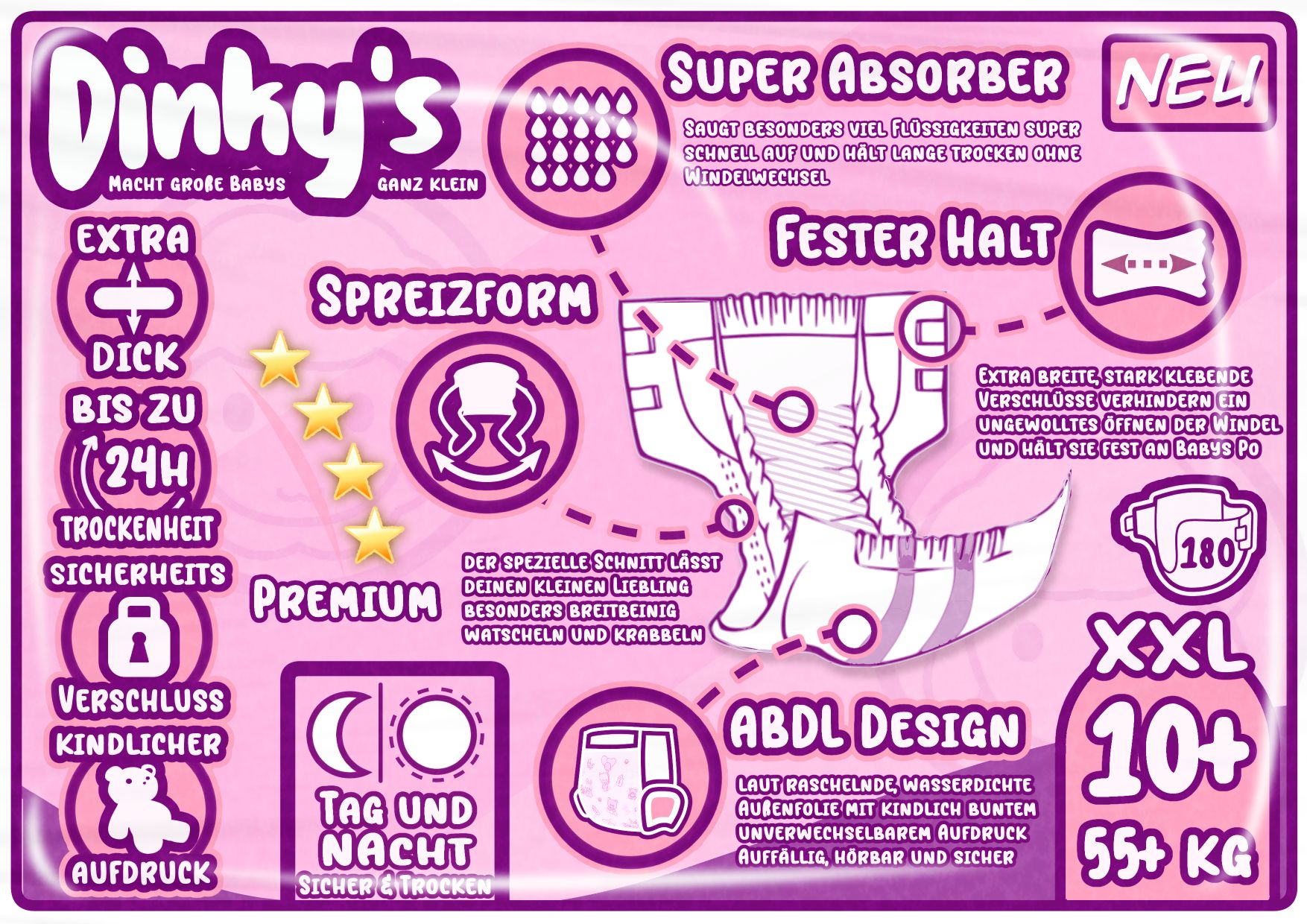 Dinky’s Windeln bieten alles, was ein Windelliebhaberherz erwärmt. Sie sind natürlich extra dick und saugstark, um über einen längeren Zeitraum getragen werden zu können. Außerdem sind sie kunterbunt bedruckt, sodass jeder sofort erkennt, um was es sich handelt. Und auch der Windelträger wird durch das lautstarke Rascheln und den breiten Schnitt, welcher ihn zum Watscheln oder gar Krabbeln zwingt, immer wieder daran erinnert, was er ist.