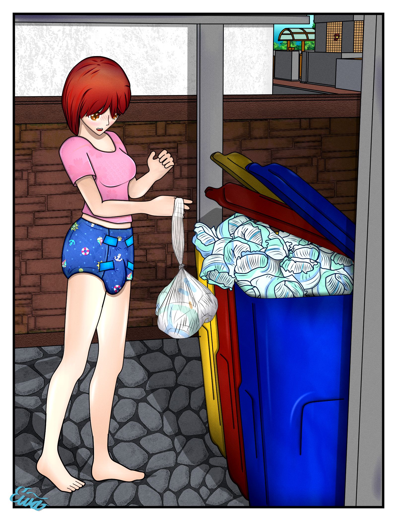 Ehe sie ins Haus zurück durfte, um sich für die Schule anzuziehen, musste sie die Tonnen auch noch vor das Haustor schieben, da heute die Müllabfuhr kam. Unter dem Spott und Gelächter ihrer Brüder und den seltsamen Blicken ihrer Freunde und Passanten, hörte sie auch ihre Mutter, dass sie die Windeln wohl für den Rest der Woche tragen musste. Was das schlimmste war, dass der Frühstückskakao bereits auf ihrer Blase drückte.
